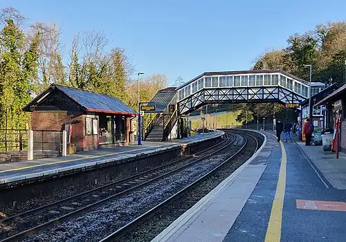 In 1969 St Merryn contractors R C Wilce and Sons demolished most of the late Victorian station buildings and replaced them with modern timber structures at a cost of £8,000.[14] Bodmin Road was renamed 'Bodmin Parkway' on 4 November 1983 and in 1989 Wilce and Sons' station buildings were replaced by brick structures.[9] In 2002/2003 a £500,000 Rail Passenger Partnership scheme saw the car park being extensively improved and the ticket office block extended.[15][16]