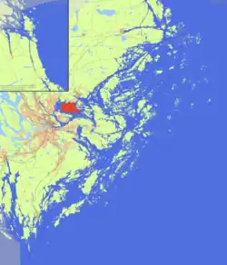 The Bogesundslandet peninsular is largely surrounded by water, with the Kyrkfjärden in the north-west, Stora Värtan in the west, Askrikefjärden in the south and the multiple waterways and islands of Vaxholm Municipality in the east and north-east. To the north a narrow neck of land connects it to the rest of the Swedish mainland.[1][2][3]