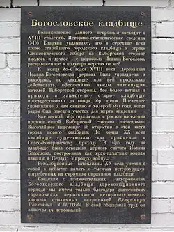Bogoslovskoe Cemetery (Russian: Богословское кладбище) is a cemetery in Saint Petersburg, Russia.[1] It is located in the Kalininsky District of the city between Laboratornaya Street and Prospekt Mechnikov.
