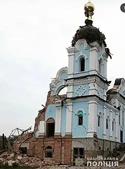 During the Russian invasion of Ukraine, the village came under attack by Russian forces in June 2022 and they occupied it on 17 August.[1][2] On September 11, 2022, during the Kharkiv counteroffensive, the Armed Forces of Ukraine liberated the village, after fighting for the settlement for more than three months. The Ukrainian flag was raised over Bohorodychne by the fighters of the 81st Airmobile Brigade.[3] Fleeing Russian troops left behind a devastation of destroyed settlement, with almost no surviving buildings, burnt military equipment, and a church completely destroyed.[4] Tortured bodies of Ukrainian soldiers, were found decapitated, as well as dead local residents with their hands tied, in cellars, at the bottom of the pool.[5] During the clearing of the village, the Ukrainian military discovered two local residents, 93-year-old Nina and her 60-year-old son Mykola, who managed to survive.[6]