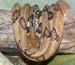 It is a large snake, reaching more than 2 m (6+12 ft) in total length. The front teeth of the upper jaw and the lower jaw are strongly enlarged.[4] The anterior palatine teeth are significantly enlarged, while the posterior chin shields are larger than the anterior ones.[5]