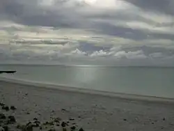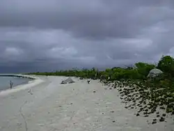 The lagoon water level is up to 1 meter (3.3 ft) higher than the surrounding ocean due to an influx of wind-driven waters over the windward ocean reef and the presence of only one narrow reef passage on the leeward side. Water cascades over the coral-covered rim and flats of the sloping leeward reef. A massive algal ridge lines the outer edge of the windward reef, while the south and west reefs are coral-covered narrow flats where landings can be made in quiet weather. A very small algal rim, 100–150 mm (4–6 in) high, on lagoon shores of the westernmost islets, on east-facing lagoon reef-fronts and on the windward edges of coral patches in the lagoon, may be a feature unique to Taongi. This rim is maintained by the constant flow of water over the reef flat.[3]