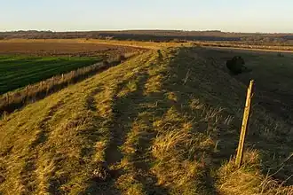 Bokerley Dyke, Bokerly Dyke,[1][2] Bokerley Ditch, is a linear earthwork 5.75 kilometres (3.6 mi) long on Cranborne Chase in Dorset, partially running along the county's border with Hampshire between Woodyates and Martin.[3] It is part of a Scheduled Monument together with Grim's Ditch and other associated earthworks.[3]