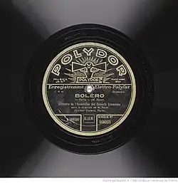 The first recording was made by Piero Coppola for the Gramophone Company on 13 January 1930.[8] Ravel attended the recording session.[9] The next day, he conducted the Lamoureux Orchestra in his own recording for Polydor.[10] That same year, further recordings were made by Serge Koussevitzky with the Boston Symphony Orchestra and Willem Mengelberg with the Concertgebouw Orchestra.[11]