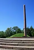 On the eve of Victory Day, May 8, 1986, the memorial of Glory was unveiled in the lower reaches of the Boldyni Hory. Four majestic figures froze on the granite pedestal in bronze: an ancient Rus' warrior in a helmet with a sword and spear and a shield depicting the ancient coat of arms of Chernihiv, a soldier of World War II, a national avenger and a working woman. Along with 5 granite stelae, bronze bas-reliefs reflect the labor, heroic and victorious history of the Chernihiv region: the march on Prince Igor Svyatoslavovich's Polovtsians, heroic episodes of the period of the so-called "Great October", civil and World War II, and guerrilla warfare.[12][13] At present, Boldyni Hory is a monument of garden and park art, a valuable historical and architectural complex, as well as a significant tourist attraction of the city and the region.