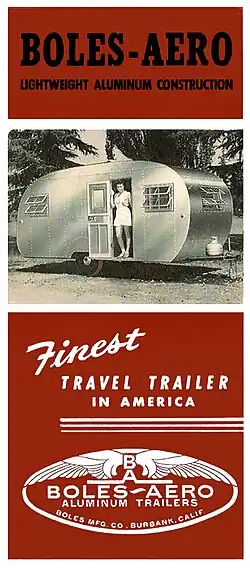 Boles Manufacturing produced the Boles Aero brand of aluminum recreational travel trailers in Southern California from 1946 to 1980. Boles Aero trailers featured aircraft style, riveted semi-monocoque aluminum construction, similar to Airstream's line of trailers. In contrast, most other camping trailers of the era were of wood frame construction, covered by a non-structural aluminum skin. Boles Aero aluminum travel trailers were central to the post-war recreational vehicle culture, the quintessential "canned ham" trailer of the mid-century American highway. Boles Manufacturing built and sold over 18,000 trailers between 1946 and 1980.[1][2][3][4][5][6]