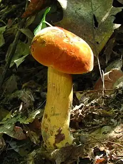Boletus subluridellus is a species of bolete fungus in the family Boletaceae. Described as new to science in 1971 by American mycologists, the bolete is found in the eastern United States and Canada. It grows on the ground in coniferous and mixed forests in a mycorrhizal association with deciduous trees, especially oak. The fruit bodies (mushrooms) have orangish-red, broadly convex caps that are up to 10 cm (3.9 in) in diameter, with small, dark reddish pores on the underside. The pale yellow stipe measures 4–9 cm (1.6–3.5 in) long by 1.5–2.3 cm (0.6–0.9 in) thick. All parts of the fruit body will quickly stain blue when injured or touched.