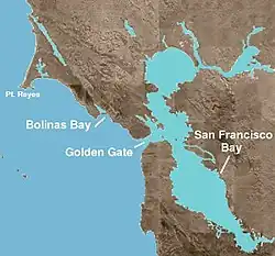 Bolinas Bay is a small bay, approximately 5 miles (8 km) long, on the Pacific coast of California in the United States. It is in Marin County, north of the Golden Gate, approximately 15 miles (25 km) northwest of San Francisco. The town of Bolinas is at its shore.