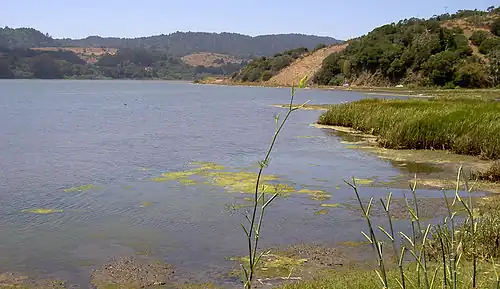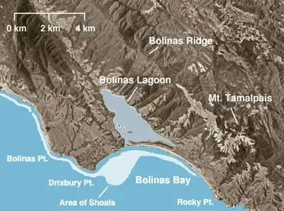 Bolinas Lagoon is a tidal estuary, approximately 1,100 acres (4.5 km2) in area,[2] located in the West Marin region of Marin County, California, United States, adjacent to the town of Bolinas. It is a part of the Greater Farallones National Marine Sanctuary. In 1974, Aubrey Neasham and William Pritchard wrote in support of Bolinas Lagoon as Drake's New Albion landing site.[3]