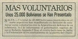 - ^ a b c d ""Falklands: 25,000 Bolivians volunteered to fight for Argentina". eltribuno.com (in Spanish). Archived from the original on 2020-04-04. Retrieved 2022-10-08.