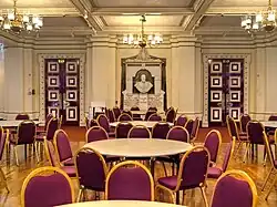 Internally, as originally constructed, the building was arranged around the central Great Hall, which was 112 feet (34 m) long by 56 feet (17 m) wide; it contained a sizeable organ by Gray and Davison and was designed to seat 1,500 people.[11] There was a Sessions Court to the west; the Council Chamber was on the upper floor to the north and the Mayor's state rooms were on the same floor to the east (including a banqueting room and, directly under the clock tower, a grand reception room). The ground floor had offices and rooms for various officials and users of the court, and to the east the Borough Surveyor and Borough Treasurer's offices. The basement level included a cell block directly below the courtroom, offices and amenities for the police (including a drill-hall directly below the Grand Hall), along with kitchens and storerooms and various civic amenity offices (which could be accessed directly via their own entrances by members of the public).[11]