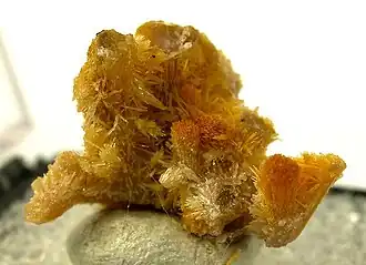 ![]() Acicular crystals of umber-yellow boltwoodite from Namibia (size: 1.8 × 1.7 × 1.4 cm) | |