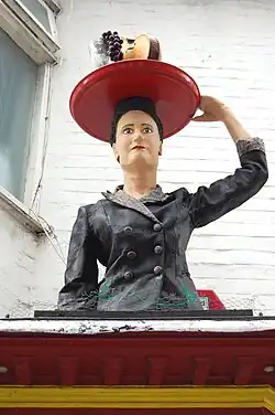On the wall outside, there was a statue of Bom-Bane, built by her brother-in-law, John Jostins, who worked on R2-D2 in The Empire Strikes Back.[6] On the night of 1 December 2012, thieves stole the statue. Jane Bom-Bane told the Argus, "I feel like my alter ego has been snatched. It has no use or value to anyone else, but it is a part of us."[6] With the theft unsolved, puppeteer Isobel Smith organised a collection from café regulars to raise money for a new statue. The second one, built by the artist Paul Harrison, was unveiled on 11 January 2015. Vandals attacked the replacement on 22 July 2017, stealing the statue's head and tray. The original statue was recovered, restored with a new tray, and replaced on the wall on 9 May 2021.