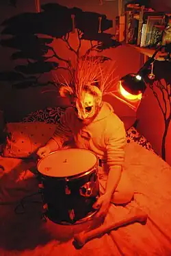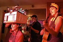 Jane Bom-Bane was born Jane Bayley in Leek, Staffordshire.[9] After moving to and growing up in Coventry, she became lead singer of the Swinging Cats, a Two-Tone band that released one single, "Mantovani."[10] In the 90s, she went solo, playing the harmonium, singing her own songs, and wearing a selection of mechanical hats that "light up and turn and move in various ways."[11] A typical hat takes the form of an animated goldfish bowl.[12] World's Weirdest Restaurants presenter Bob Blumer described her hats as "part genius and part outsider art. What I love about the hats is that they are not highly polished, finely tuned specimens. They are more like little kinetic high school art projects that sit on your head."[3]