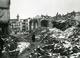 The 12 October raid was the last major raid suffered by Bologna during 1944; in the final months of the year, the city was only subjective to minor raids (on 13, 14, 15, 21, 24 and 30 October, 6, 11 and 22 November, 1, 10, 14, 18, 21, 22, 25, 26, 27, 28, 29, 30 and 31 December).[57] The dwindling intensity of air raids on the city, along with the movement of the frontline, with the Gothic Line turning the Bolognese Apennine into a battlefield, reversed the evacuee situation; most of the people that had left Bologna during the previous months returned to the city (whose historic centre had been declared "Sperrzone", area where military traffic was interdicted, by the German command), and along with them came tens of thousands of inhabitants of the Apennine villages, fleeing the fighting that was now ravaging their valleys. As a consequence of this, in the winter of 1944-1945 the population of Bologna nearly doubled from that of 1940; between residents and Apennine refugees, some 600,000 people were now living in the city.[58][59] Many of the Apennine farmers brought their livestock with them; the ruins of the Neoclassic Teatro del Corso were turned into stables and haylofts, as were other buildings.[60] In order to house the refugees and the homeless, the Municipal Assistance Authority requisitioned 11,450 apartments and built collective accommodation for 60,000 people, but these measures weren't enough; many camped amid the ruins of destroyed buildings.[61]
