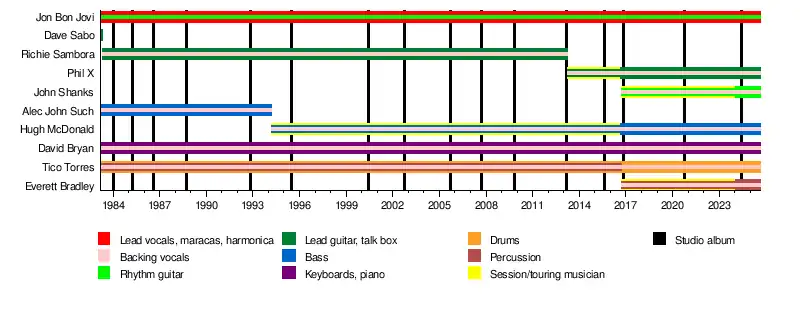 Bon Jovi is an American rock band formed in Sayreville, New Jersey in 1983. The band consists of singer Jon Bon Jovi, keyboardist David Bryan, drummer Tico Torres, guitarists John Shanks and Phil X, percussionist Everett Bradley,[1] and bassist Hugh McDonald.[2] Original bassist Alec John Such left the band in 1994, and longtime guitarist and co-songwriter Richie Sambora left in 2013.