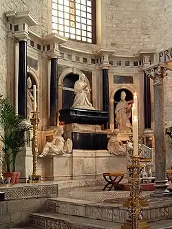 Bona died in the early morning of 19 November 1557, at the age of 63. It is suspected she was poisoned by trusted household members.[11] She was buried in the Basilica di San Nicola in Bari, where her daughter, Anna, had a tomb erected for her in Renaissance style.[12]