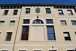 The building is built in Indiana limestone, three stories high with an intermediate mezzanine level, low pitched green tile roof. A very careful Renaissance building that marks an early response to the Renaissance revival of the early twentieth century associated with "Ecole de Beaux Arts Classicism." A serious building with triumphal arch entrance and a grand flight of exterior stairs; the stairs are flanked by large lamps on copper tripods. Simple columns with Ionic capitols. The building is unified by a continuous cornice with a dentil course and egg and dart molding below that. Inside there is a large oval foyer and high skylighted room beyond, currently used as a display gallery. Marble has been used on the floors and some walls. Public spaces carry the classical motif throughout in moldings, panels, engaged columns and pilasters with appropriate capitols and bases. The west side of Bond Hall, opposite the main entrance, features a semi circular courtyard. On the facade, there is a sculpture of Vitruvius by Miklos Simon.[20] The bust stands over an inscription featuring a quote from his De architectura: