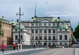 The Bonde Palace (Swedish: Bondeska palatset) is a palace in Gamla stan, the old town in central Stockholm, Sweden. Located between the House of Knights (Riddarhuset) and the Chancellery House (Kanslihuset), it is, arguably, the most prominent monument of the era of the Swedish Empire (1611–1718), originally designed by Nicodemus Tessin the Elder and Jean De la Vallée in 1662-1667 as the private residence of the Lord High Treasurer Gustaf Bonde (1620–1667) it still bears his name, while it accommodated the Stockholm Court House from the 18th century and since 1949 houses the Swedish Supreme Court.[1] On the south side of the building is the street Myntgatan and the square Riddarhustorget, while the alleys Riddarhusgränd and Rådhusgränd are passing on its western and eastern sides.
