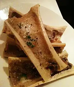 Beef bone marrow is also a main ingredient in the Italian dish ossobuco (braised veal shanks); the shanks are cross-cut and served bone-in, with the marrow still inside the bone. Beef marrow bones are often included in the French pot-au-feu broth, the cooked marrow being traditionally eaten on toasted bread with sprinkled coarse sea salt.[7]
