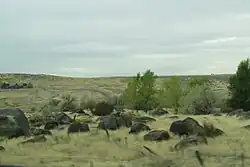 At the peak of the flood, approximately 33,000,000 cubic feet per second (930,000 m3/s) poured over the Snake River Plain at speeds of up to 70 miles per hour (110 km/h) and deposited hundreds of cubic miles of sediments eroded from upstream.[8] The flood scoured the 600-foot-deep (180 m) Snake River Canyon through the underlying basalt and loess soil, creating Shoshone Falls and several other waterfalls along the Snake River. It also carved and increased in size many other tributary canyons, including those of the Bruneau River and Salmon Falls Creek. The flood then entered Hells Canyon, significantly widening the gorge. Its waters eventually reached the Pacific Ocean via the Columbia River.[9]