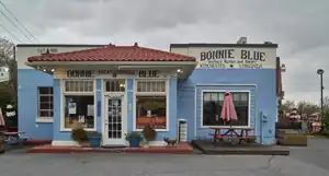 Bonnie Blue Southern Market & Bakery, more commonly known as Bonnie Blue, is a restaurant located at 334 West Boscawen Street in Winchester, Virginia, United States. It specializes in barbecuing various meats, and offers side dishes and baked goods. The meat and other items are often purchased from local producers. The restaurant opened in 2012 inside a former Esso gas station built in 1920. It is sited at the triangular intersection of Amherst Street (U.S. Route 50) and West Boscawen Street. The restaurant is named after the Bonnie Blue flag used by the short-lived Republic of West Florida. The building is painted light blue to signify the name. Bonnie Blue eventually outgrew its original space and expanded into an adjoining building. The restaurant is decorated with eclectic signs and objects.