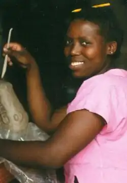 At Ardmore, Bonnie Ntshalintshali was at first an apprentice, but in time she and Halsted ran the studio more as partners. In 1988 Ntshalintshali won the Corobrik National Ceramics Award. She and Halsted were jointly named winners of a Standard Bank Young Artist Award in 1990.[3] The catalogue for this exhibition, written by South African fine artist Andrew Verster, described Ntshalintshali's ceramics as follows: "The characters in Bonnie's work, the animals, the birds and the people are all individuals. One is attracted to them precisely because they are such powerful personalities."[3] In 1991, she was invited to design fabric prints based on her ceramics for a festival in Grahamstown. Her ceramics were featured at the Seville Expo in 1992, at the Venice Biennale in 1993, and at the South African Bienniale in 1995. Ntashalintashali's designs often drew from Zulu folk culture or Biblical motifs.[5][6] Her sister-in-law Beauty Ntshalintshali, her half-brother Vuzi Ntshalintshali, and another relative, Somandla Ntshalintshali, all joined her at Ardmore and also learned the shop's distinctive style.[7][8]