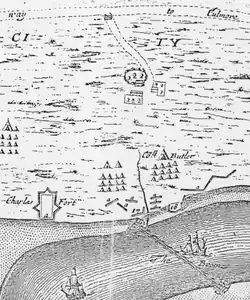 Boom and Fort Charles in 1689, including the site of Boom Hall