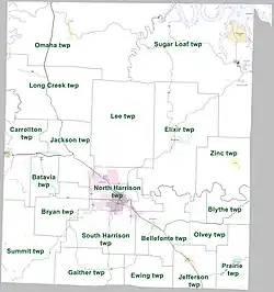 Former townships include Bear Creek, Crooked Creek, Elmwood, Harrison, Washington, and Young.