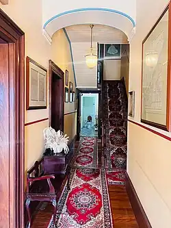 At ground floor level, the original main core of the house is made up of four rooms, a central hallway and a staircase. Large double bi-parting doors separate two of the main rooms ( original dining and drawing rooms). The hallway leads to an original lavatory box room and cellar. a doorway from the original dining room leads to the original detached kitchen wing and service entry, and subsequent 1896 attached kitchen and rear access. There are three fireplaces, one with marbled paintwork on timber. The chimneys for these fireplaces were closed up, with all cleaned and two reopened during the conservation.[1]