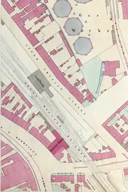 Bordesley station was opened in 1855 by the Great Western Railway on their main line from London (Paddington) to Birkenhead (Woodside). It was originally a two platform station, north of Coventry Road, but was rebuilt as a four platform station with two island platforms when the line was upgraded to four tracks during 1915. The station once had extensive cattle sidings adjacent to and on Duddeston Viaduct. This viaduct was intended to link the line from Bordesley to the Derby Line but was left incomplete when it was realised that trains would be unable to serve Birmingham Curzon Street railway station, where rail services then terminated.[1][2]