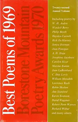 The Borestone Mountain Poetry Awards was an annual series of poetry anthologies first published in 1949.[1] The poems were selected from those published in a given year in English-language magazines and books; in each volume, individual poems were designated as first, second, or third place in a poetry contest.[2] Additionally, the first ten volumes printed poems that were selected in a competition for undergraduate college students. Twenty-nine volumes were published through 1977.[3][4]