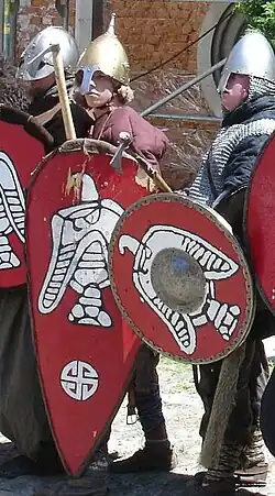 White swastika painted on Viking shields (historical re-enactment, Bielsko-Biała, Poland)