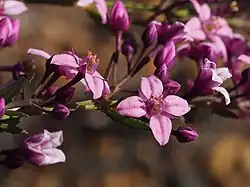 Boronia tenuior is a species of flowering plant that is endemic to Western Australia. It is an open shrub with thin, square stems, simple, serrated leaves, and pink to mauve, four-petalled flowers.