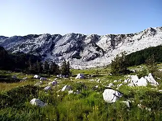 The Borovi do is a pan-shaped sinkhole on Orjen at 1470 mm AA. It lies to the north of the Reovačka greda col on the Bijela gora plateau. During the glacial stages of the Pleistocene, the Borovi do was heavily glacierized. It formed the central part of the huge Orjen ice-cap.[1] With ice reaching approximately 430 m thickness, several short valley glaceriers were formed at the margin of the ice-cap. The Borovi do has a remarkable microclimate as it sustains a major cold-air pool for the whole of the Dinaric mountain range. Analysis revealed,[2] that during the January 2017 European cold wave, the cold-air lake that formed in the Borovi do was amongst the coldest spots in Montenegro.