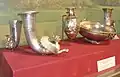- Three rhyta, each a different size, and with a different base. The largest has a figure of a sphinx and bears the inscription: "[Belongs to] Cotys from [the town of] Beos.", as well as the name of the craftsman, Etbeos.[5] The second has a figure of a horse, and the third, the smallest, has a bull. Each are half figures.