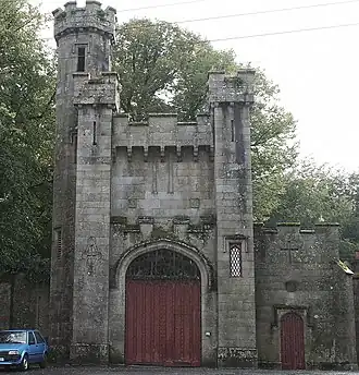 Borris House was constructed in Tudor style in 1731 by Morgan Kavanagh of the MacMurrough Kavanagh dynasty.[3] During the Irish Rebellion of 1798, the house was regularly attacked by Irish republican rebels. The first attack occurred on 24 May 1798 when 5,000 rebels attacked the house. It was defended by a Borris yeomanry unit commanded by Walter Kavanagh, which repelled the attack with 50 casualties.[4] A further attack on 12 June was aimed at the houses of the yeomanry as well though this time the yeomanry were backed up by soldiers from the Prince of Wales's Own Donegal Militia. The rebels fired a howitzer at the house and caused damage to the walls but were unable to break them down and were obliged to retreat.[4] It was restored in 1820 by the architects Richard and William Vitruvius Morrison.[3]