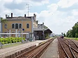 The diesel-worked Borsdorf–Coswig and the electrified Riesa–Chemnitz lines cross in Döbeln Hauptbahnhof. It was opened on 2 June 1868. Sidings on the Coswig line north-east of the Hbf are electrified. The station building of 1868, unchanged to this day, is a heritage listed building. Between 1892 and 1926 the Döbelner Straßenbahn, a horse tramway, ran for two kilometres (1.2 mi) from the station to central Döbeln.