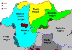 Borsod (10) and Gömör-Kishont (9) counties after the Treaty of Trianon. In 1923, the two counties were merged to form Borsod-Gömör County. (6) Nógrád County (7) territory assigned from Gömör-Kishont County to Nógrád County in 1921. (8) territory assigned from Gömör-Kishont County to Borsod County in 1938. (11) the city of Miskolc (urban county).