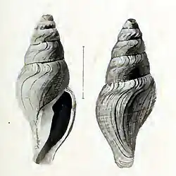 (Original description) The rather thick shell has a fusiform shape and is yellowish-white. The upper whorls are lost by erosion. Of the remaining 6 whorls the upper ones are still eroded, of the 4 whorls which are in sufficient state of preservation, the upper 2 are slightly angular, their upper part a little excavated, the lower part more convex, with a single row of nodules on the limit. In the lower ones the shell is slightly excavated below the suture, but otherwise regularly rounded, without nodules. The sculpture consists of numerous arcuate striae, with stronger ones at intervals, indicating the margin of the sinus at former periods, and very faint traces of spiral striae in the excavation of the upper whorls, lower part of each whorl is sculptured with very fine growth-striae, likewise stronger at intervals and rather weak spiral lirae, of which there are 2 below the angle of the upper sculptured whorl, 2 or 3 on the next, 5 on penultimate and numerous ones on the body whorl. This latter is regularly attenuated towards the base and runs in the rather long, large canal, which in its basal part is free from lirae and only sculptured by fine and groovelike growth-lines. The aperture is angularly ovate, with a moderately sharp angle above, ending below in a rather wide, slightly contorted siphonal canal. The peristome is a little broken, probably rather thick, with a wide, rather shallow sinus above, then regularly arched. The columellar margin is concave at the upper part, along the body whorl, then thickened, with an obtuse, oblique fold at the upper part of this thicker one, directed to the left below, along the siphonal canal. The interior of the aperture is smooth, white, the whole columellar side with a strong layer of enamel.[2]
