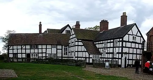 Frontage of the 16th-century farm, adjoining the 19th-century structure, seen in the background. The older building is genuinely timber framed, although the outer skin has been replaced with brick. -