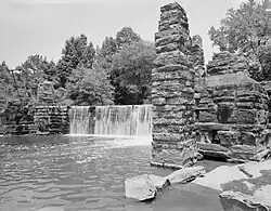![]() Boshell's Mill in 1973, with the sawmill on the left side of the dam and the gristmill on the right. | |