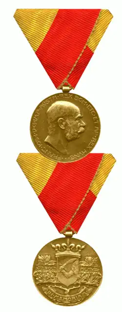 The Bosnia-Hercegovina Commemorative Medal (German: Bosnisch-Hercegovinische Erinnerungsmedaille) was founded on 30 August 1909, to commemorate the annexation of Bosnia and Herzegovina into the Austro-Hungarian Monarchy in 1908. Bosnia and Herzegovina itself had been occupied by the dual monarchy of Austria-Hungary since 1878. Legally, however, it remained part of the Ottoman Empire until 1908, when it was annexed by the empire as a condominium between Austria and Hungary. The exact number of awards is uncertain because it was awarded not only to soldiers, but also to civil officials. The number is believed to be approximately 2800.