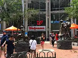 The statues are the centerpiece of the park and were sculpted by Robert Shure. The two groups represent two families, one starved and ragged owing to the deprivations of the famine, the other well-fed having found prosperity in America.[5] It is said to emphasize the transformation from an "anxious immigrant" to a "future of freedom and opportunity" in America for the Irish, the first of a long line of immigrants to Boston and America.[5][6] The sculptures are accompanied by eight narrative plaques.[4] The memorial lies on Boston's Freedom Trail (across from the Old South Meeting House)and is visited by more than 3 million people per year.[5][7]