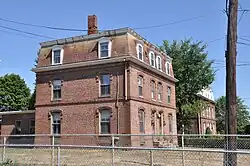 380–410 River Street consists of a pair of rowhouses located on the south side of River Street, between Jackson and Elm Streets. The eastern of them includes six units in a wood-frame structure, while the western one has ten units in a brick structure. Both are two stories in height, with gabled roofs. Entrances to the units are arranged in pairs, sheltered either by a hood supported by Italianate brackets, or by a portico supported by posts. These units were built by the BMC in the 1880s, as it expanded eastward. This type of housing was once quite common in the city, and these rowhouses are one of only two known groups to survive relatively intact (the others are on Lawton Place).[4]