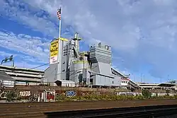 The Charlestown, Massachusetts, plant is a highly visible landmark for commuters on the north side of Boston, because it is located between the Central Artery North (part of Interstate 93) and the MBTA Commuter Rail tracks just north of North Station. Its tower directly abuts the new Leverett Connector, and the ramps connecting the Zakim Bridge with the Tobin Bridge completely surround the plant, which supplied concrete for the Big Dig project which constructed them.[3]