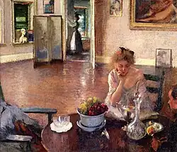 Other painters associated with the Boston school include Joseph DeCamp,[5] Philip Leslie Hale,[6] Lilian Westcott Hale,[7] John Joseph Enneking,[2] Gretchen Woodman Rogers,[8] Aldro Hibbard,[2] Frederic Porter Vinton,[9] Lilla Cabot Perry,[10] Elizabeth Okie Paxton,[11] Hermann Dudley Murphy,[12] W. Lester Stevens,[13] and others. Tarbell's teacher at the museum school, Emil Otto Grundmann, is sometimes included in this group.[14]