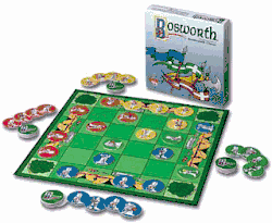 Bosworth has certain rules for game set-up and placing new pieces on the board. The game board has 36 squares, in a 6x6 pattern, but the four corner squares are marked by trees, which designate the squares as impassable, and the remaining four squares between the trees on each side are marked by tents and are the "camps" of the pieces.