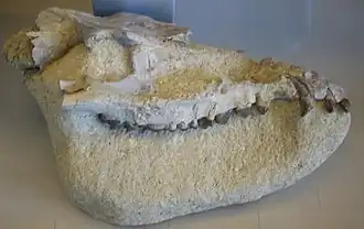 The bothriodontines are a paraphyletic assemblage of anthracotheres that originated from Eurasia in the late middle Eocene (Bartonian). The group can be distinguished from other anthracothere lineages by their upper molars having a mesostyle occupied by a transverse valley, selenodont cusps, a ventrally concave symphysis, elongated muzzles, and a diastema between the canine and first premolar tooth. During their evolution, the bothriodontines evolved from small basal forms such as Qatraniodon into larger taxa such as Libycosaurus and Merycopotamus. In some genera, the snouts became even more elongated and teeth specialized in a folivorous diet (e.g., Bothriodon, Aepinacodon), while others like Merycopotamus developed wide, heavy, and shallow muzzles with teeth more adapted for grazing.[1]