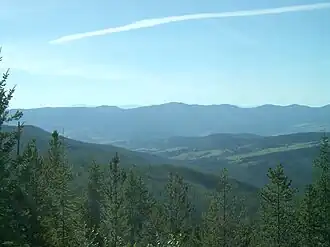 The Kettle River range has a documented history of large wildfires over the past century. Colville National Forest records attribute the smaller fire seasons in the early 1900s to wet summer conditions preventing larger conflagrations, and larger fire seasons such 1910, 1914, and 1920, to dry conditions.[20] 1929 saw abnormally dry conditions across the region, the daily high winds blowing from the south exacerbating the 6% to 10% ambient humidity.[20] Started on the eastern slope of the Kettle Range, the area of Boulder Creek south to around 12 mi (19 km) north of the Colville Reservations northern border was burned in the massive Dollar Mountain Fire[21][2] which destroyed an low estimate of 98,000 acres (40,000 ha)[20] or up to 142,000 acres (57,000 ha).[22] The fire was finally extinguished in late fall of 1929.[20]
